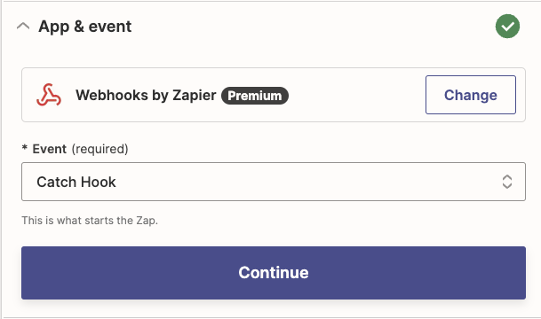 1. In Zapier, create a new Zap that is triggered by webhook. Copy the Zapier url for the next step