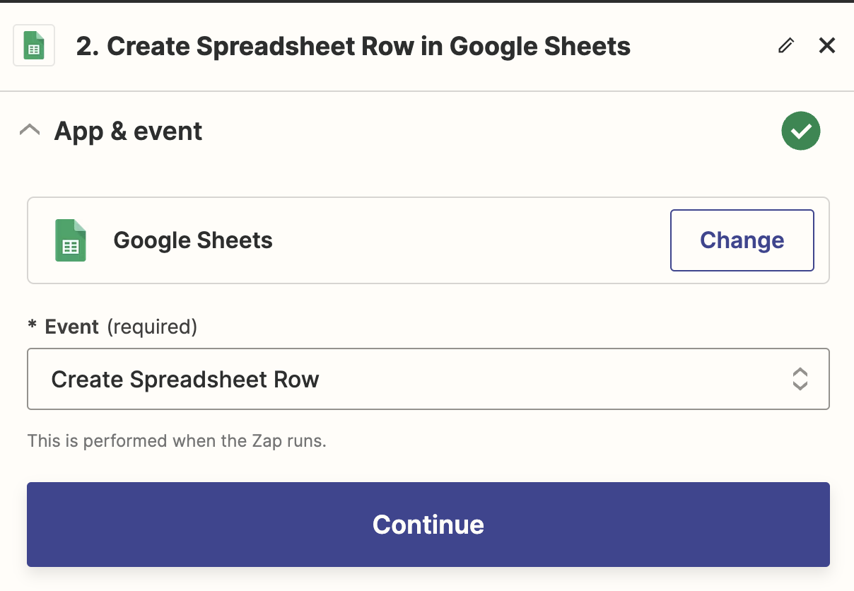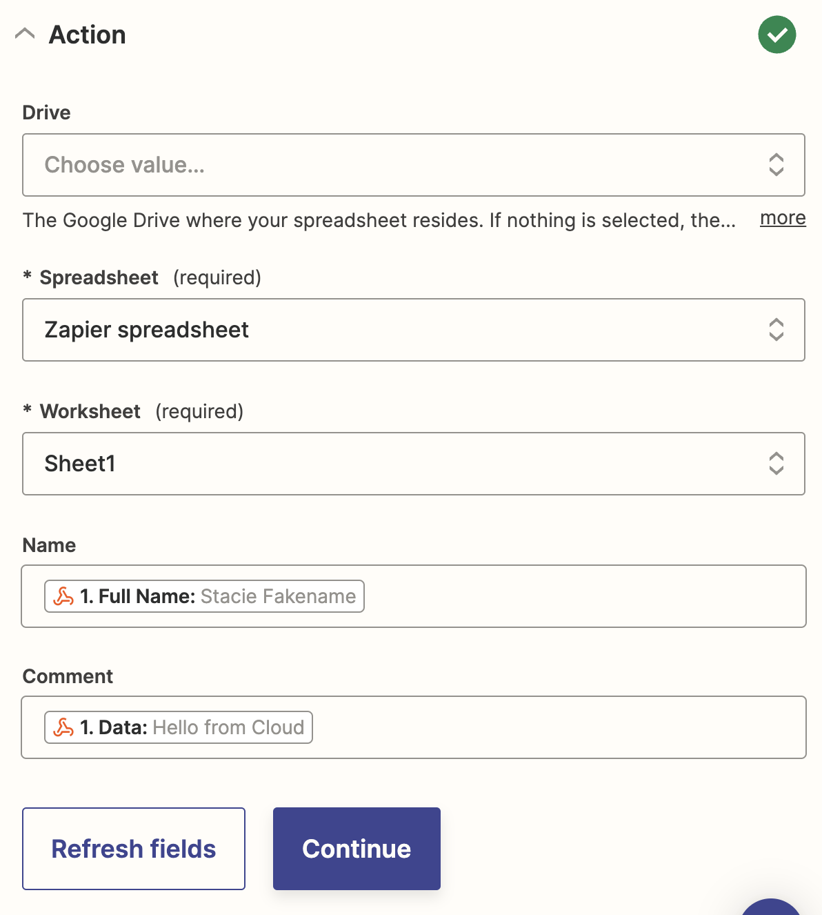 • In the Action section, select a spreadsheet with column headers, and select Refresh fields to populate the section with inputs. Map the webhook fields from the trigger to fields in the spreadsheet and click continue.
