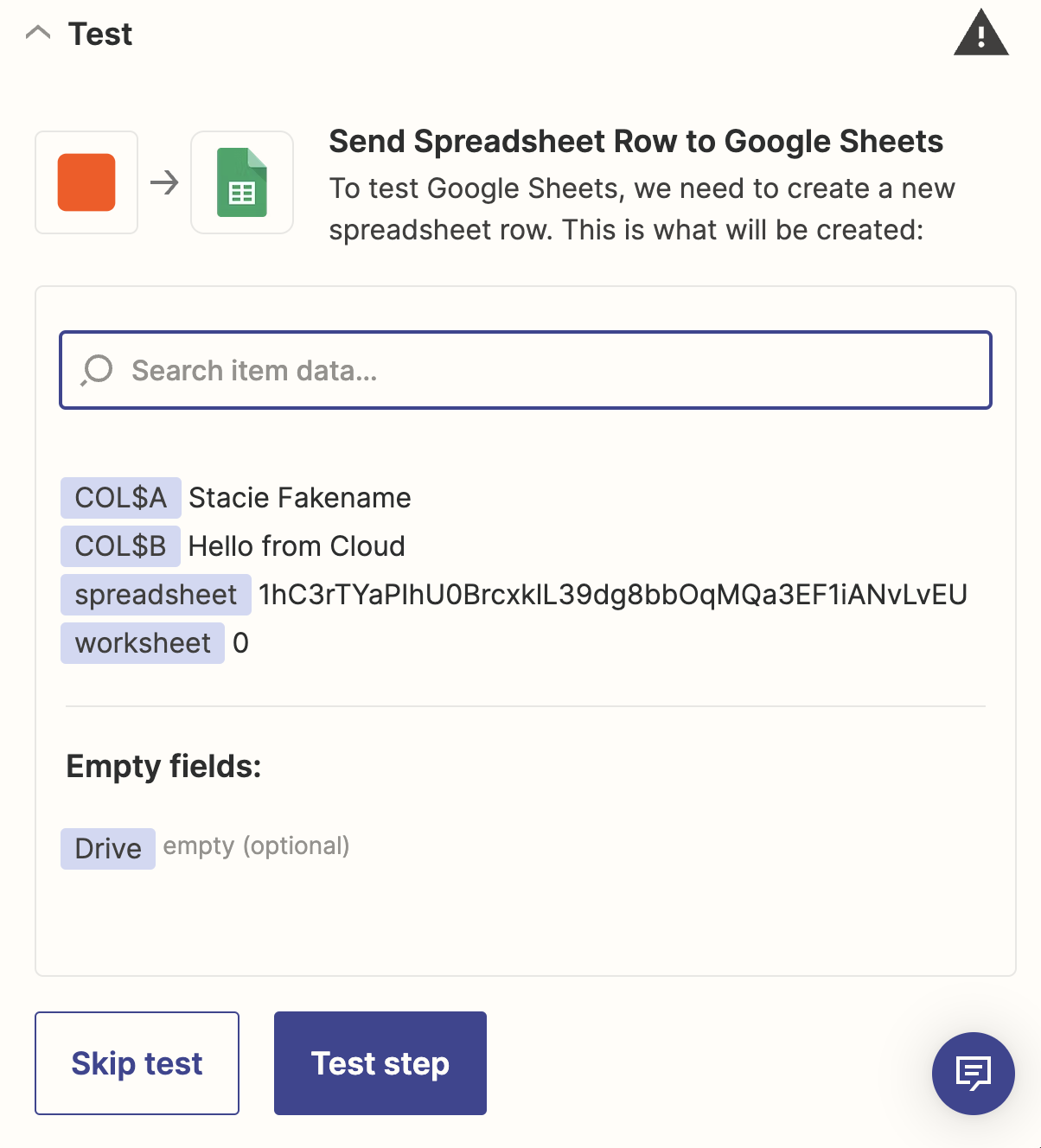 • In the Test section, click Test/Retest step to create a row in the spreadsheet with the webhook data.