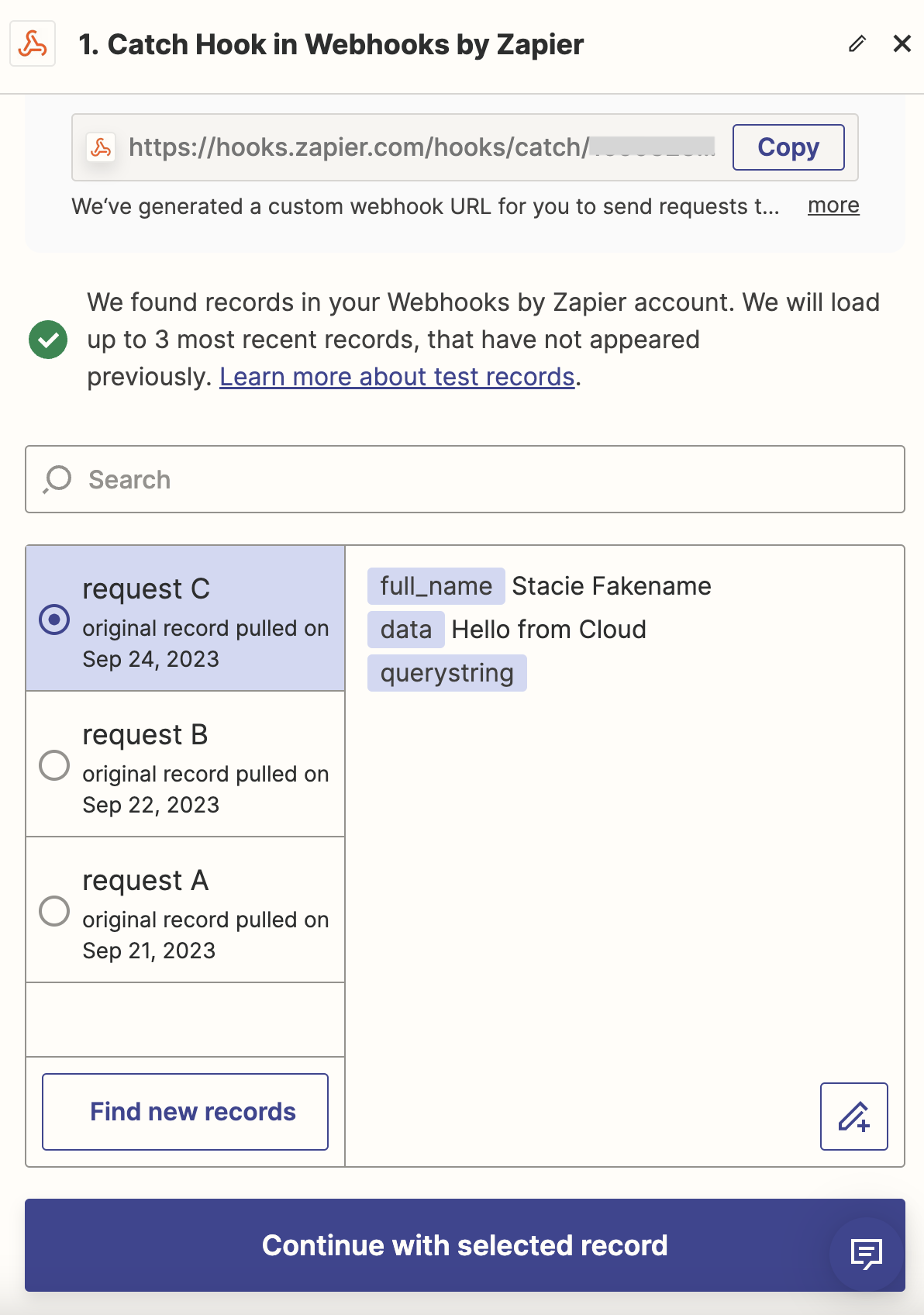 Back to Zapier to edit the webhook Zap. Click Find New Records to see the data we sent from the previous step. Click the Continue with the selected record button.