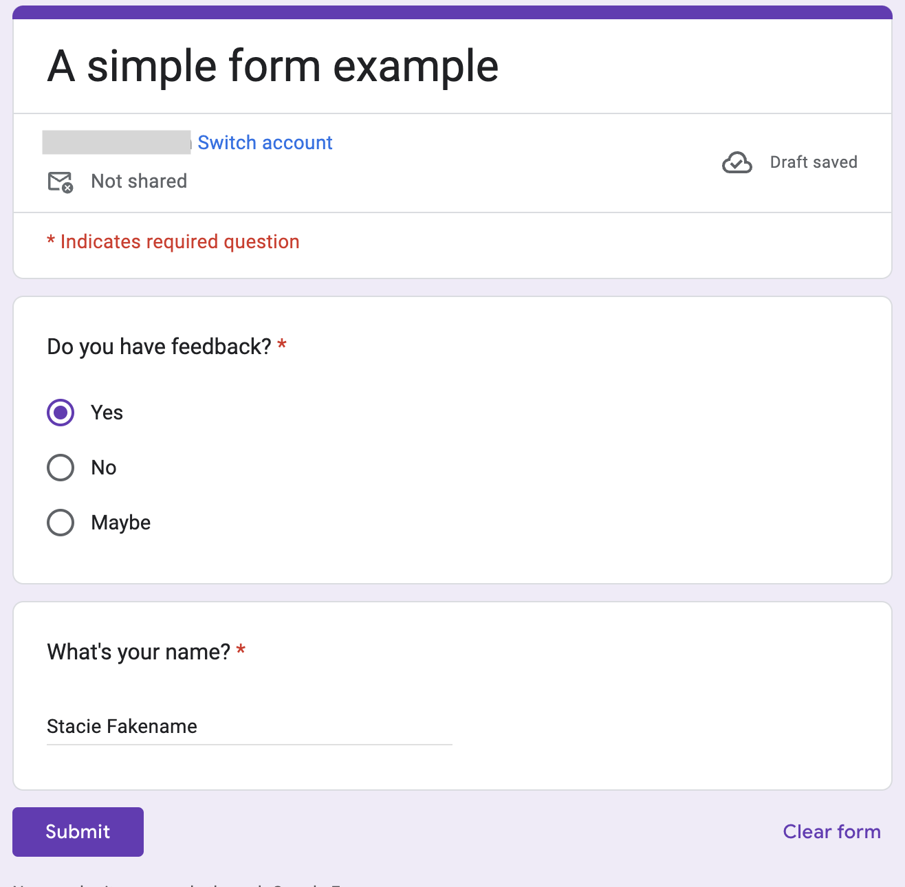 {"name": "Stacey Fakename", "feedback": "Yes"}