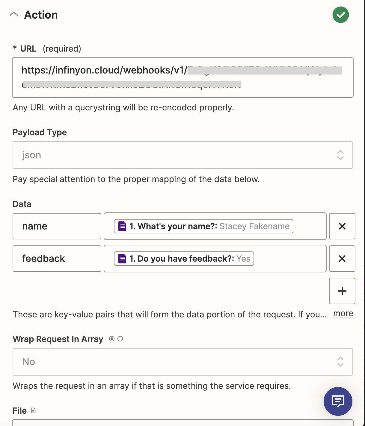 • Under Action, for the URL field, paste the URL for your InfinyOn Cloud webhook